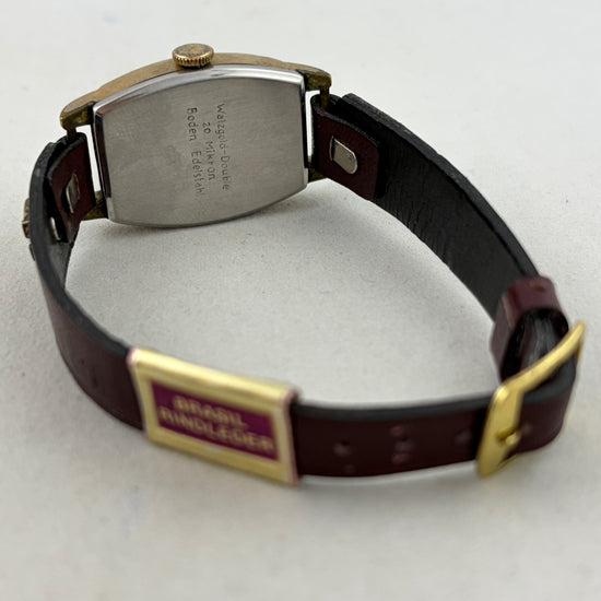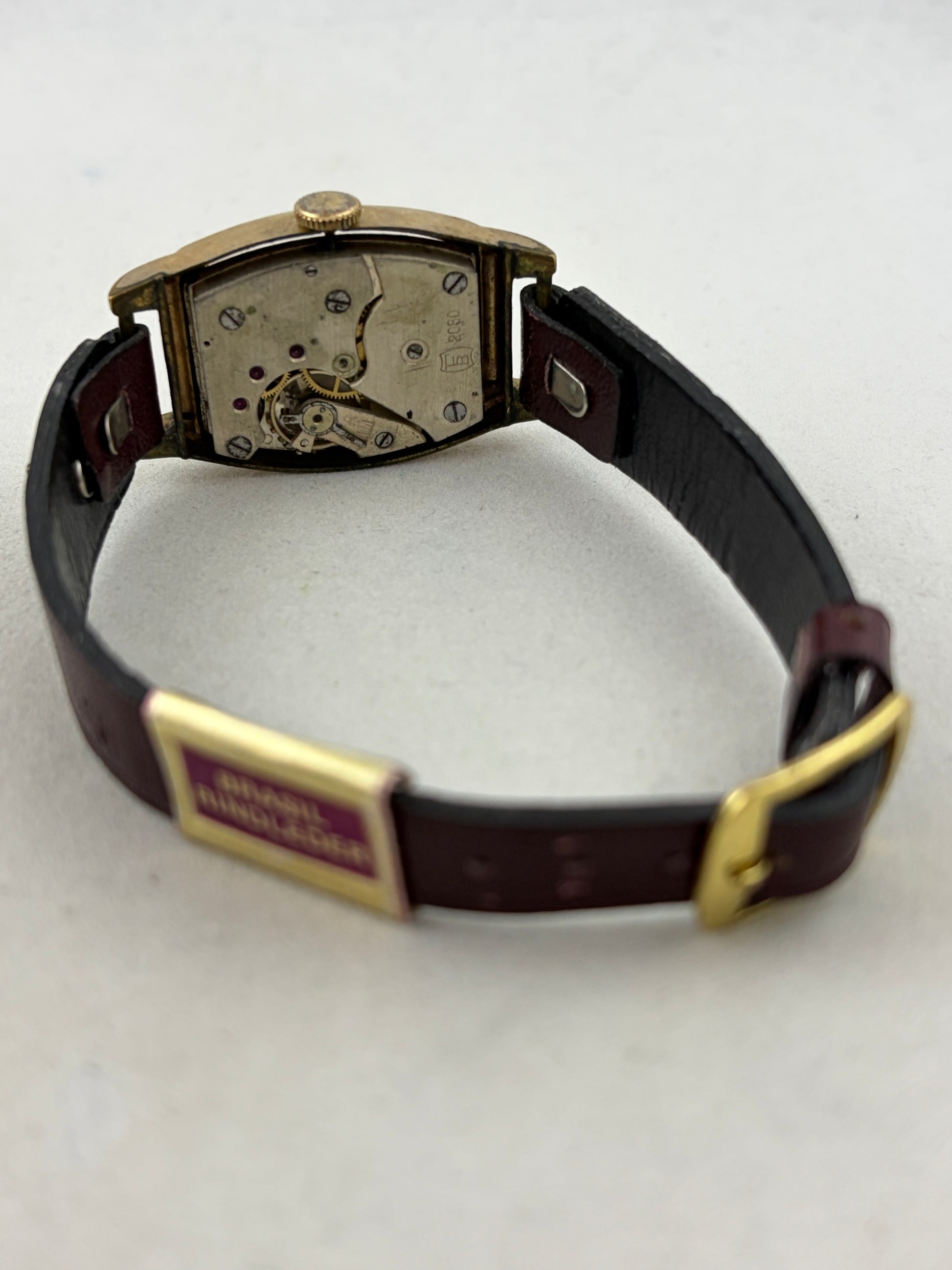 Det har synlige ridser på kassen og lidt materialeslid på forsiden og bagsiden. Der er mindre slid på skiven, og det lysende materiale på minutviseren er faldet helt af.